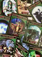 I designed this set of 16 trading cards featuring your favorite gremlins and mine! Cards are single-sided and printed on gloss 130# cardstock then cut individually by hand. Cards come in green protective sleeves.