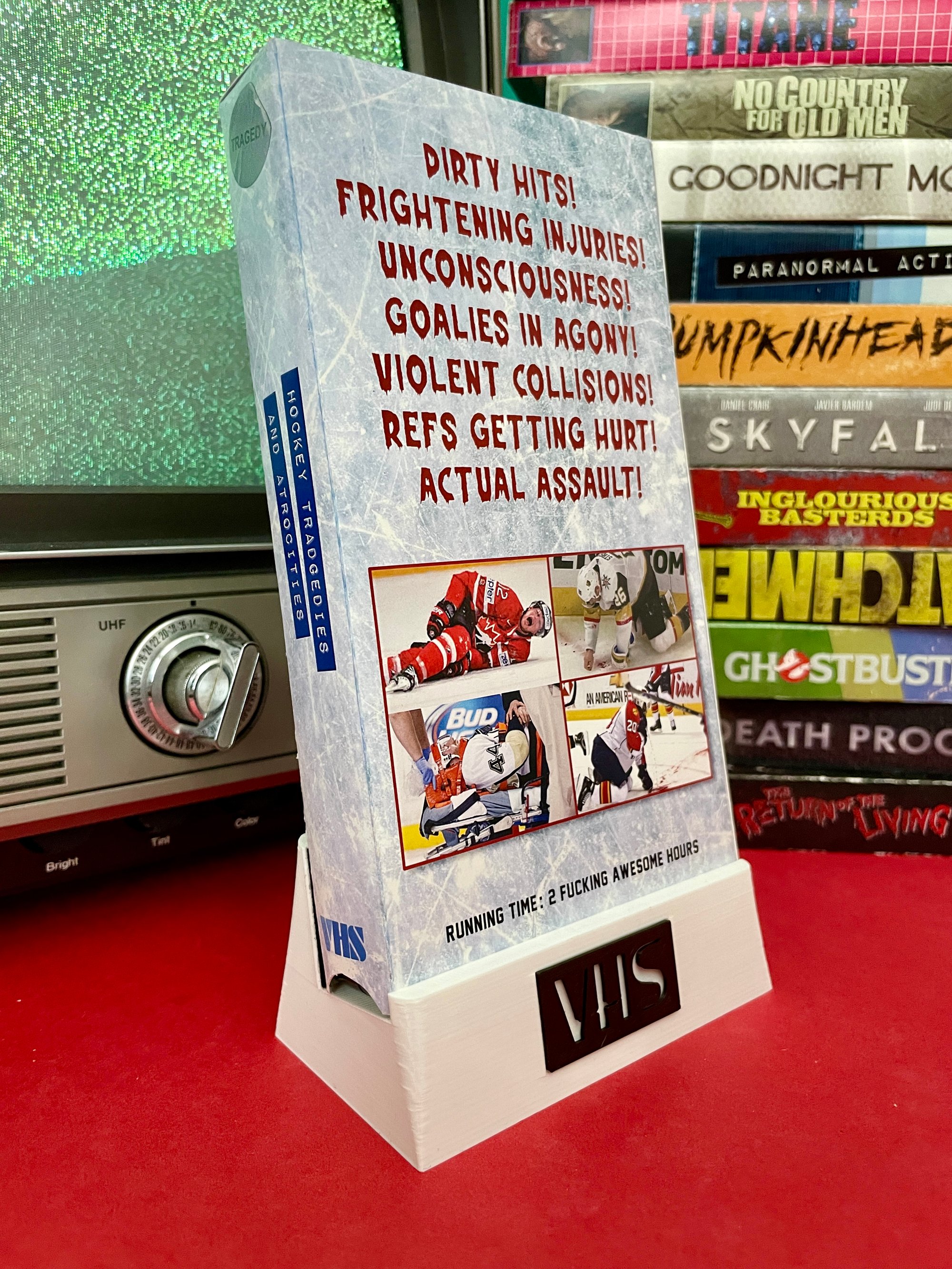 Fully playable VHS with a custom, handmade sleeve! A two-hour compilation of the worst and most shameful moments in hockey! Media is presented in 4x3 and comes on a black cassette.
