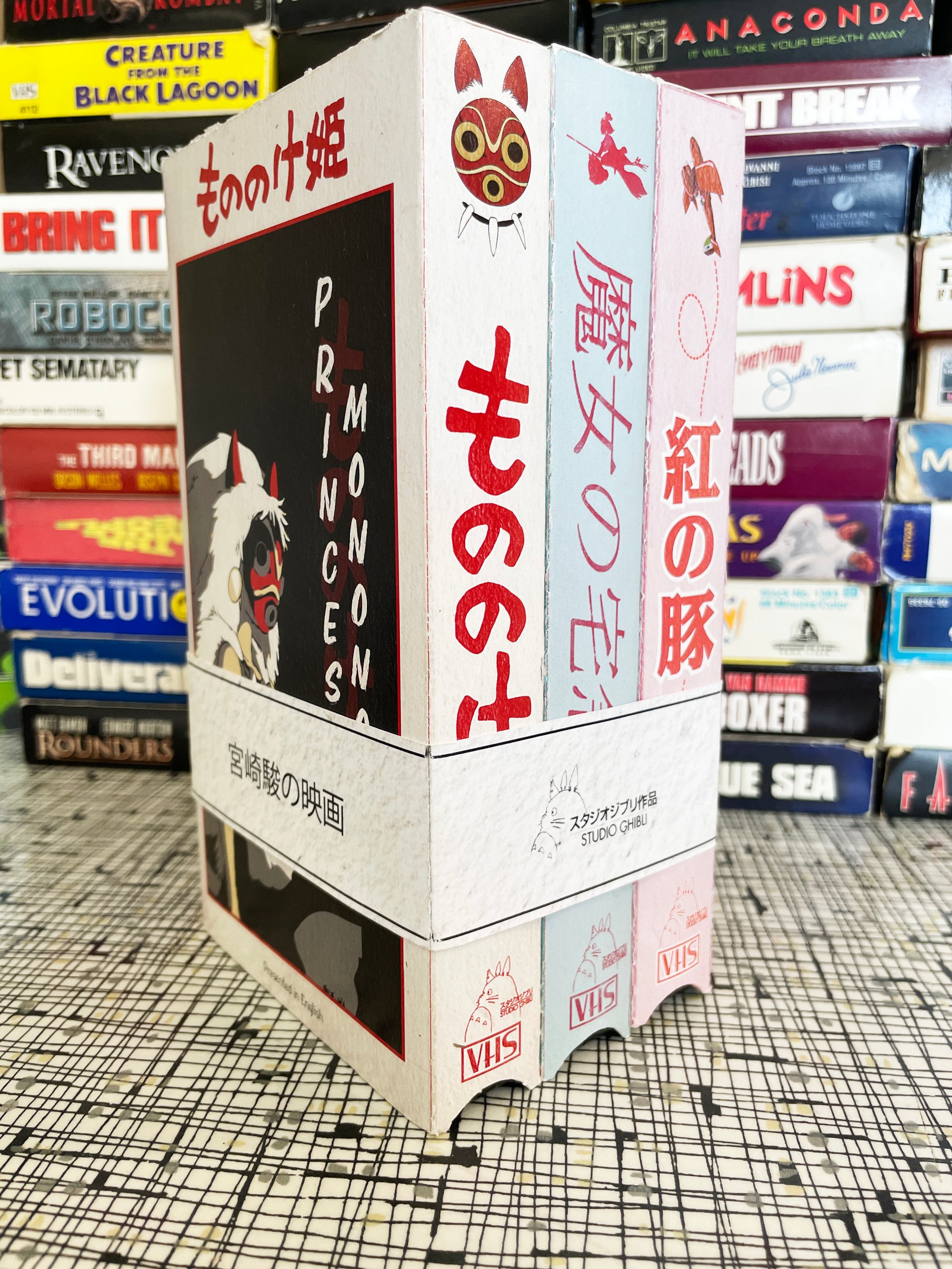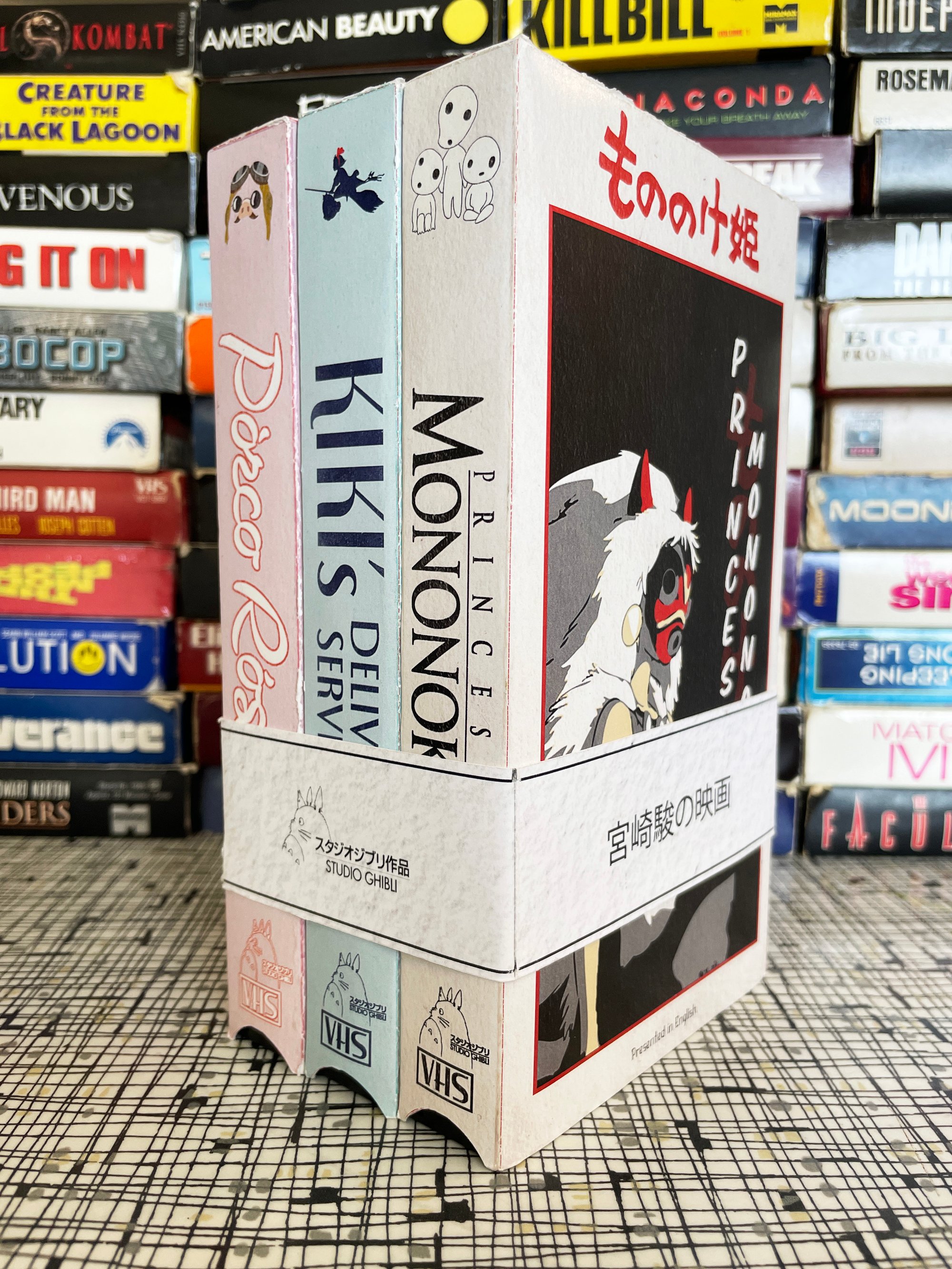 Fully-functional VHS tapes with a custom-made sleeves and labels! I design the covers like a digital collage with details for fans to catch. Then cut, score, fold, and assemble the boxes individually by hand.