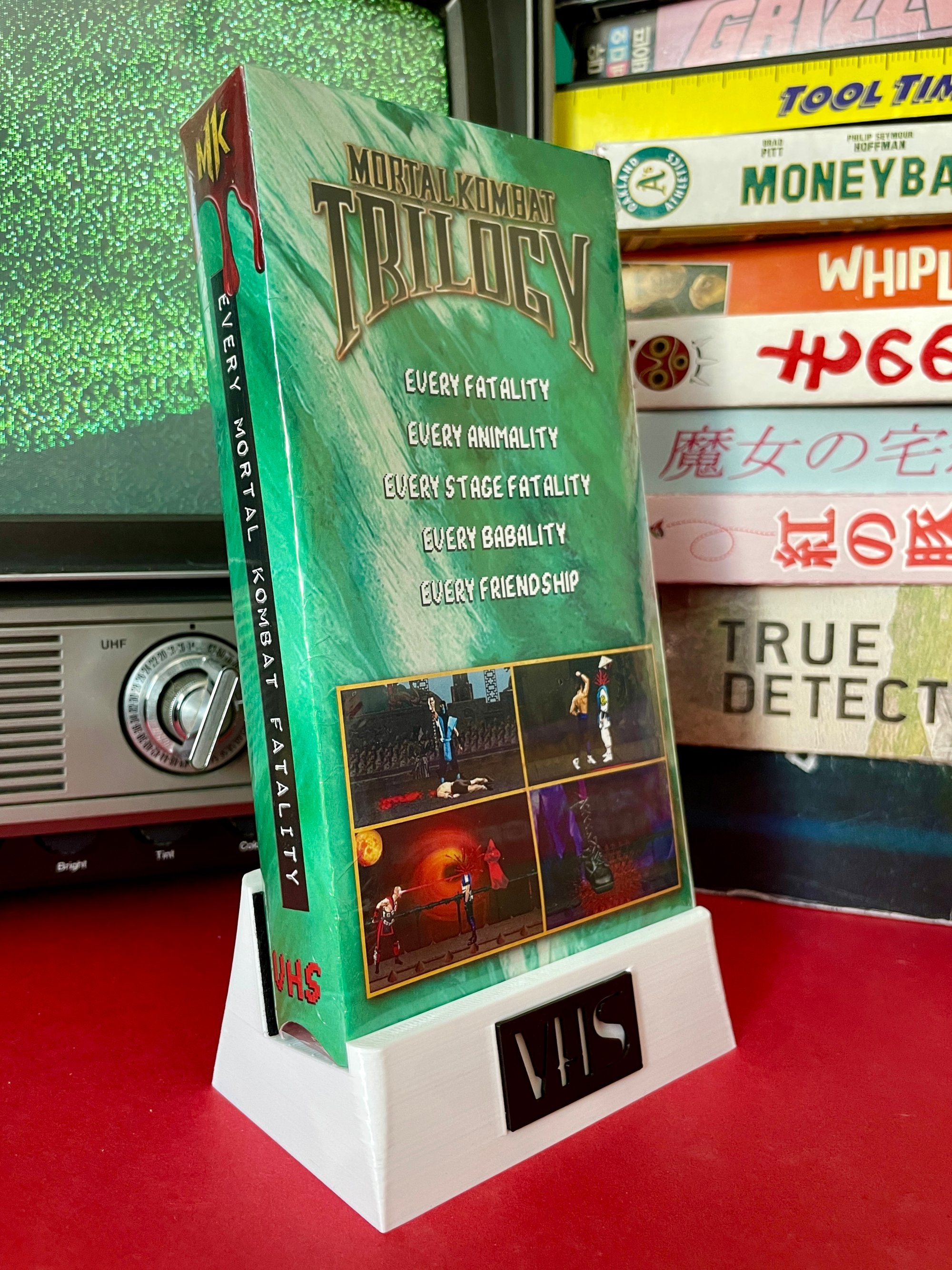 Fully playable VHS with a custom, handmade sleeve! 45 gorey, blood-filled minutes of every fatality from the original Mortal Kombat Trilogy! How cool! Media is presented in 4x3 and comes on a black cassette.