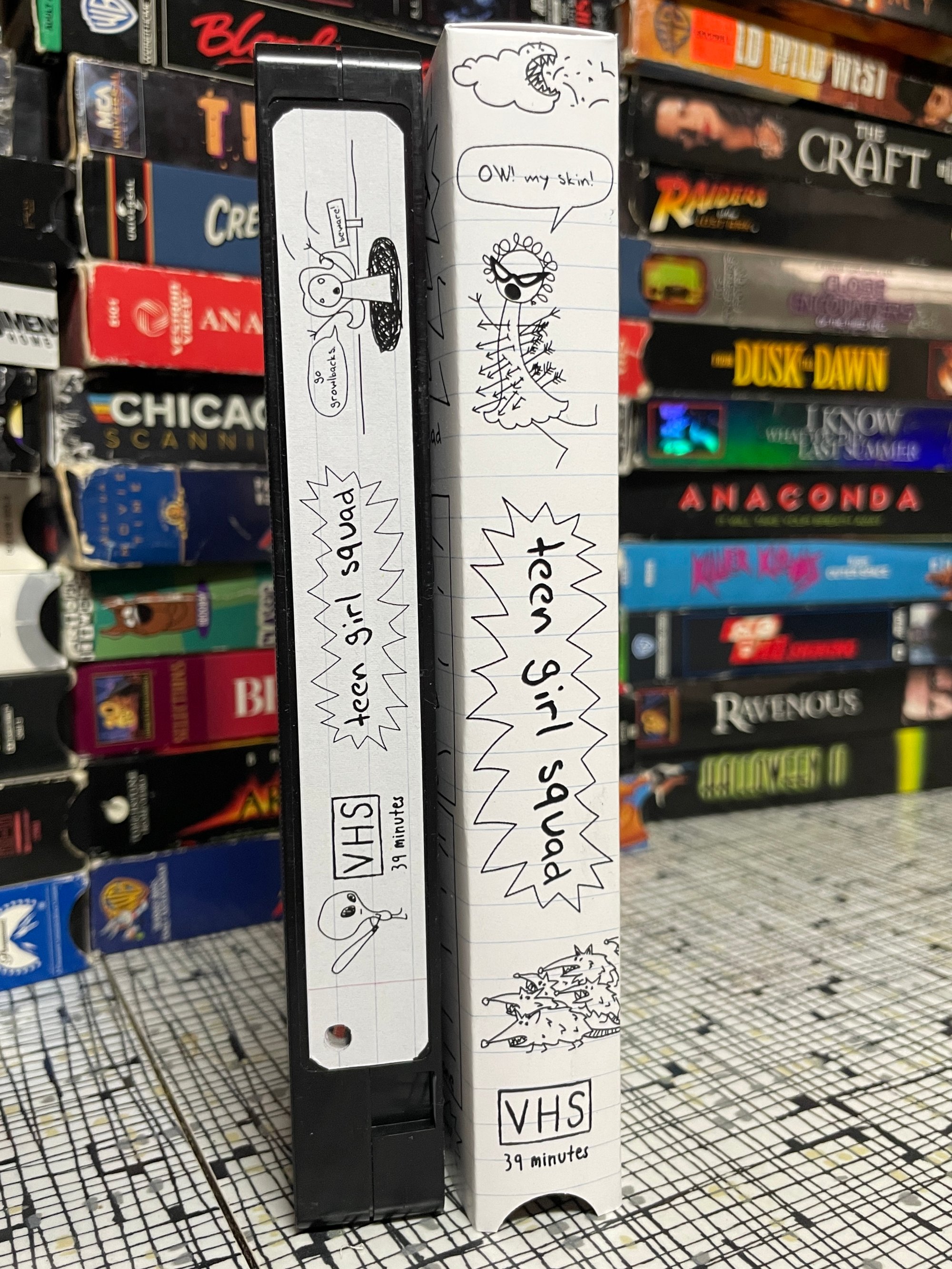 This is a fully-functional VHS with a custom-made sleeve and labels! I design the covers like a digital collage with details for fans to catch. Then cut, score, fold, and assemble the boxes individually by hand.